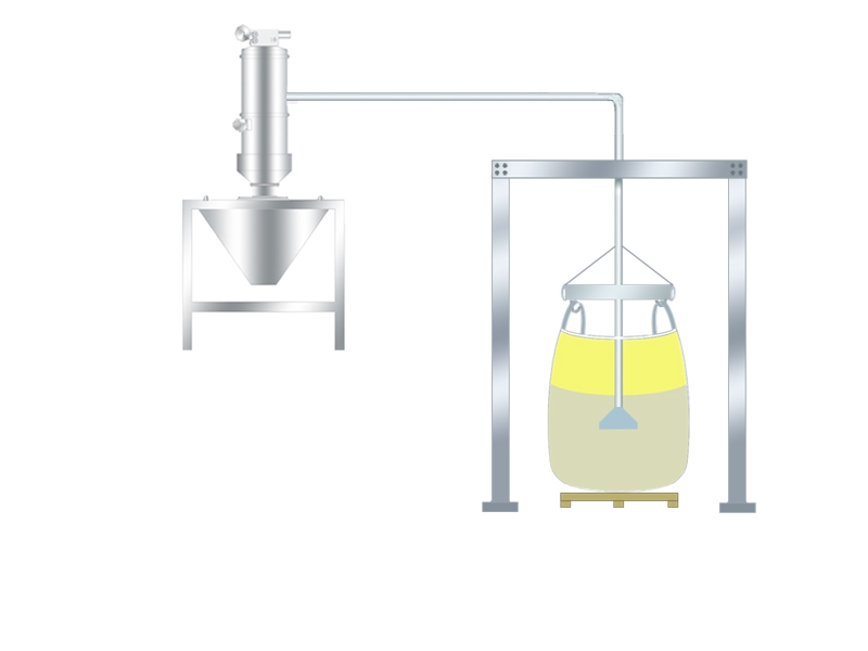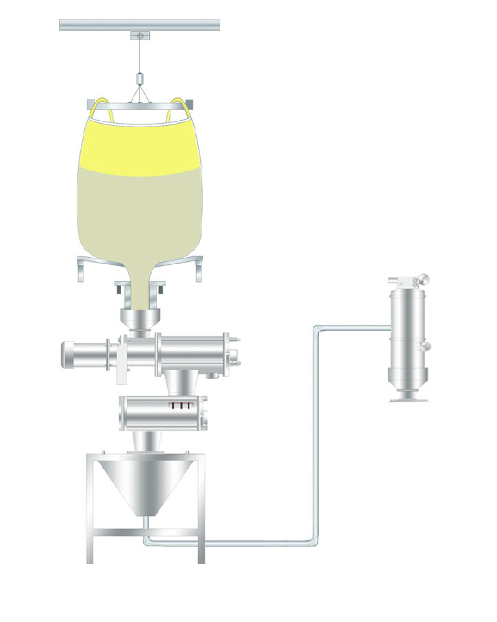 說(shuō)明:此種吸料方式是由下往上吸料,拆包機(jī)下部出口需加裝補(bǔ)氣裝置。