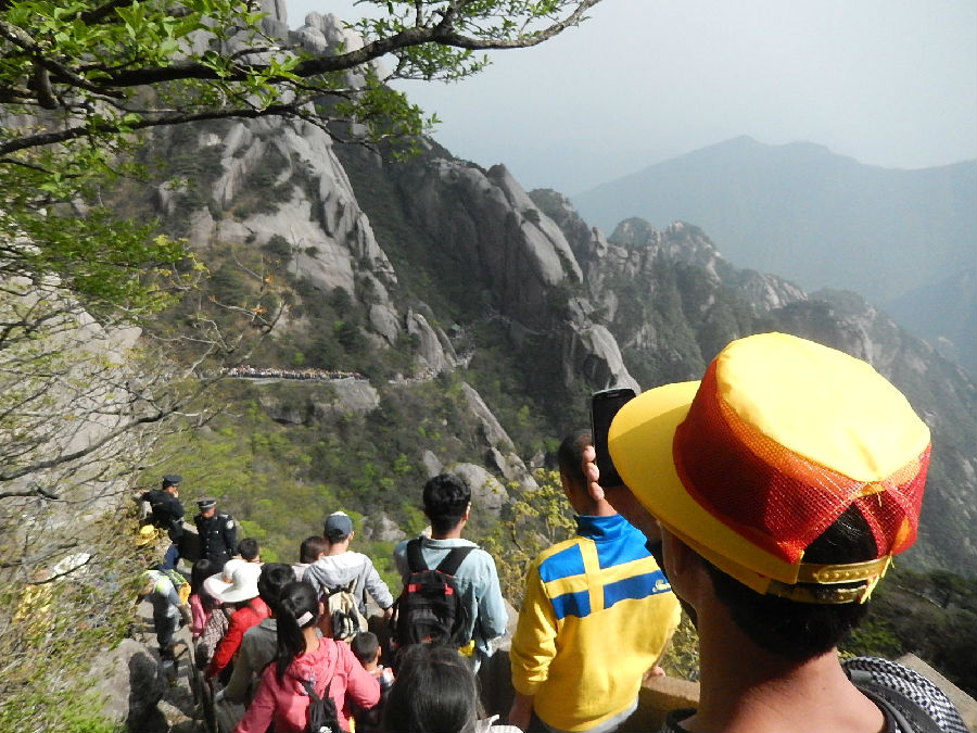看過上圖,不知幾個人還能睡得好,雖然白天爬山太累??本人也本著之前去過一次黃山,認(rèn)為黃山的風(fēng)景還是很秀麗的,所以在今年5.1又帶家人去了一次,由于過節(jié)太擠了,索道太難等了,全家都是從云谷索道爬上去的,因?yàn)槲胰ミ^一次,所以就由我?guī)ьI(lǐng)家人從以前走過的線路走的.本以為這次也帶家人看一看黃山在書中所寫的半山寺外抬頭見,展翅金雞叫道衢;登上龍蟠回首睹,扶肩五老上天都的風(fēng)景,可惜月份去得太早了點(diǎn),樹也才發(fā)芽,葉子都還沒有長出來,最難受的那就是人太多,一路是走走停停,不遠(yuǎn)的路都要走比平時多幾倍的時間.